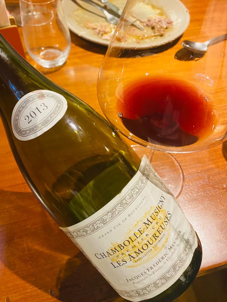 Les Amoureuses, localizado logo abaixo de Musigny, tem um solo bastante pedregoso com boa proporção de calcário ativo. Um vinho de grande finesse, delicado ao extremo. Podemos dizer que sua delicadeza é tal que fica próxima a uma linha comum por sua suposta fragilidade. Contudo, é preciso prestar atenção, pois é uma delicadeza de profundidade e bela estrutura para envelhecer. Aqui a acidez, muito mais que seus delicados taninos, fornecem bons anos de vida em adega. Como classificação é um Premier Cru, mas com Cros Parantoux de Vosne Romanée, e Clos St Jacques do grande Rousseau em Chambertin forma a trilogia dos “falsos” Grands Crus. Nas mãos de Frederic Mugnier, que o considera a epítome da borgonha, nasce um vinho floral, elegante, com uma longa persistência. A safra 2013 está num bom momento. A pergunta é: beber na juventude ou nos terciários? A mim agrada o floral da adolescência.